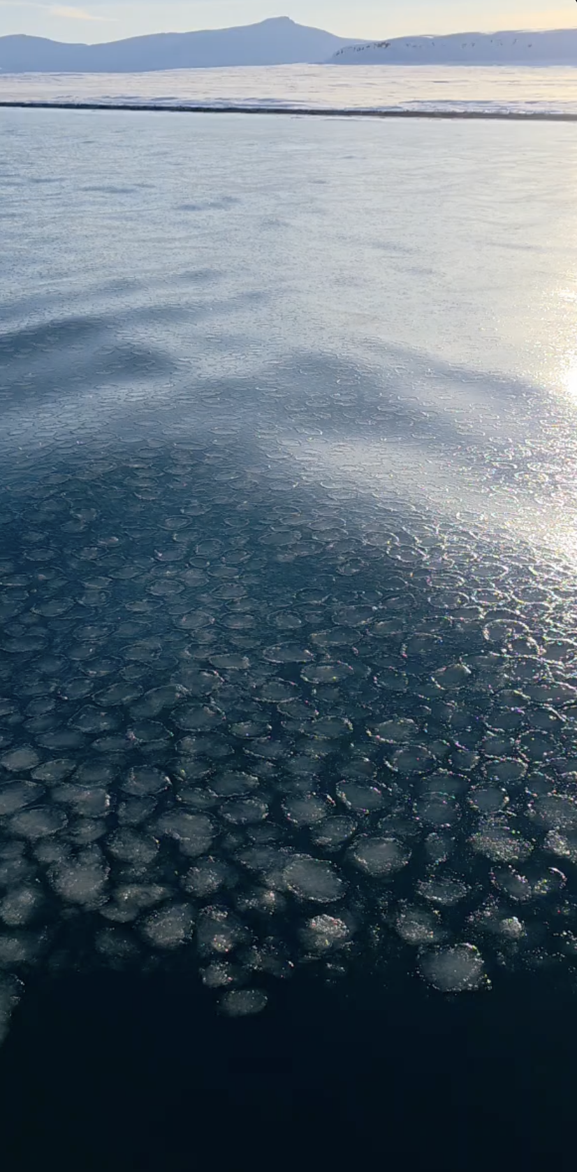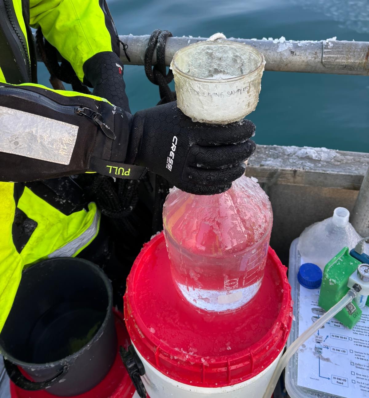 An unserem zweiten Tag auf See ist es beispielsweise noch kälter als am ersten. Auf der Meeresoberfläche bildet sich Schneematsch und sogenanntes Pfannkucheneis. Dieses besteht aus kleinen runden Scheiben aus Eis und bildet sich vor allem bei starkem Wellengang. Die hohen Wellen und das starke Schaukeln des Schiffs machen die Arbeit an Bord an diesem Tag zu einer besonderen Herausforderung. Selbst das Filtrieren des Seewassers wird zu einem Rennen gegen die Zeit: Das Wasser gefriert direkt auf den Filtern! So schnell es geht schnappen wir mit unseren eiskalten Händen alles, was wir brauchen, und machen uns auf den Rückweg in den sicheren Hafen.