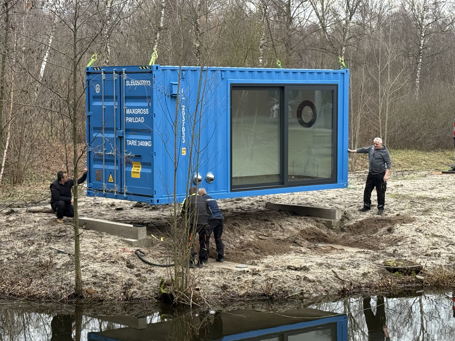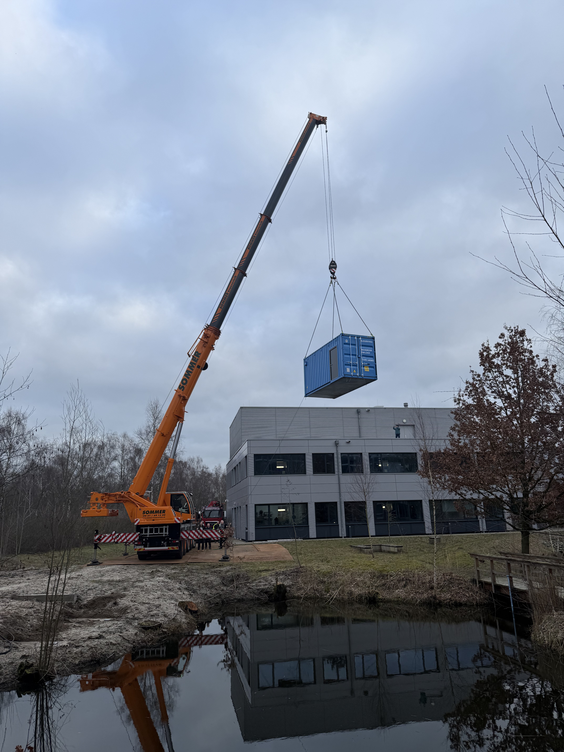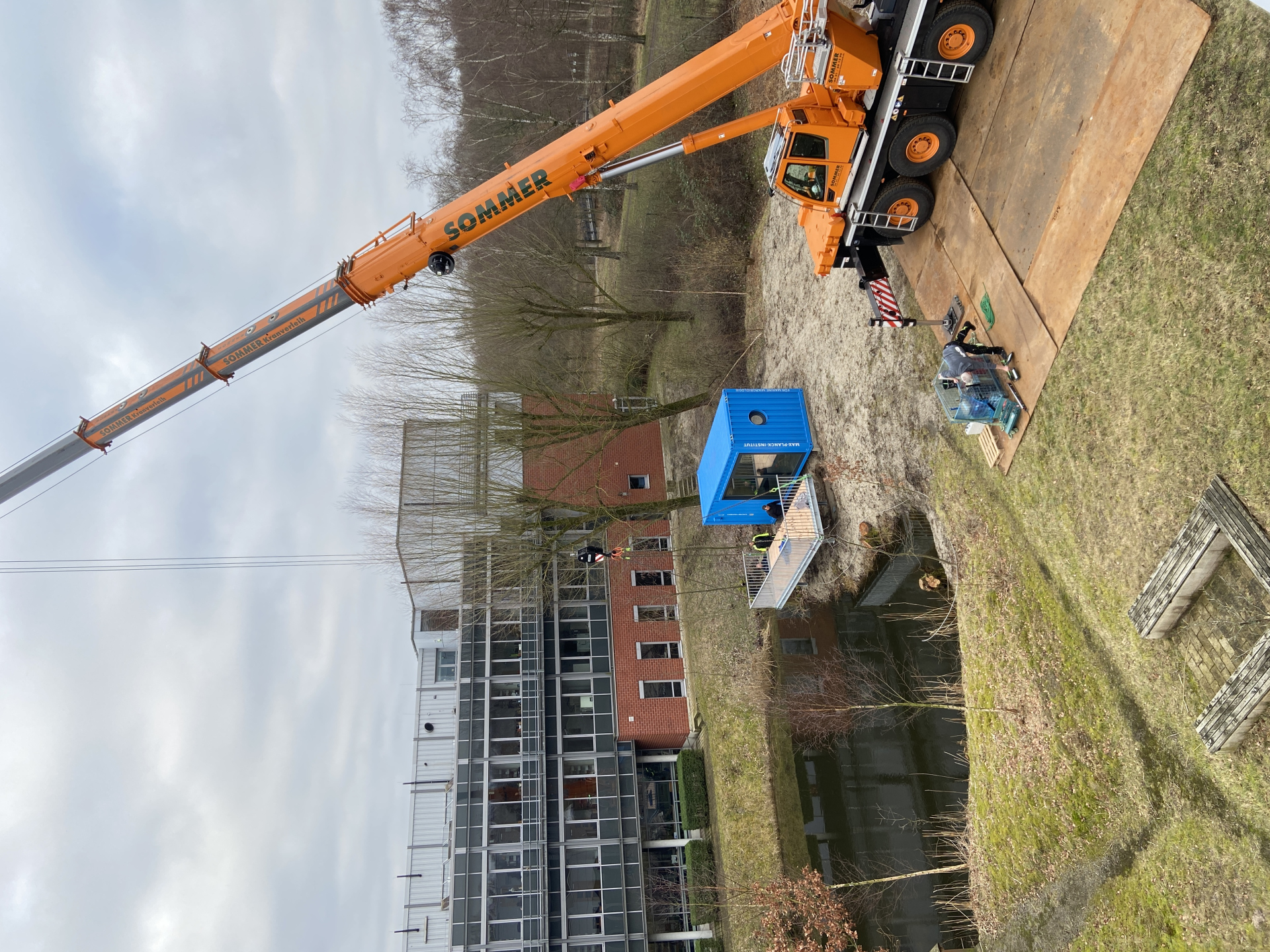 Das gilt nicht nur für viele unserer Forschenden, sondern neuerdings auch für einen ausgedienten Schiffscontainer, der zukünftig bei uns als Besprechungsraum dienen soll. Gestern ist der 20-Fuß-Container am Institutsteich installiert worden. Bei bestem Wetter konnten Lieferant, Kranführer, Elektriker und viele andere den Container auf sein zuvor gegossenes Fundament hieven.