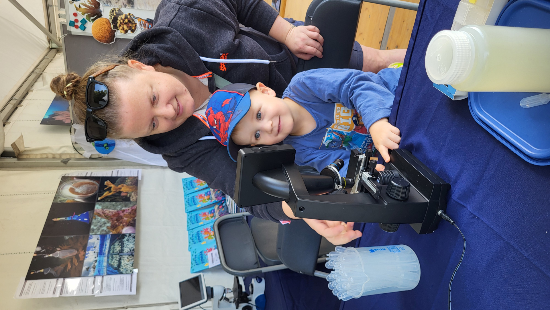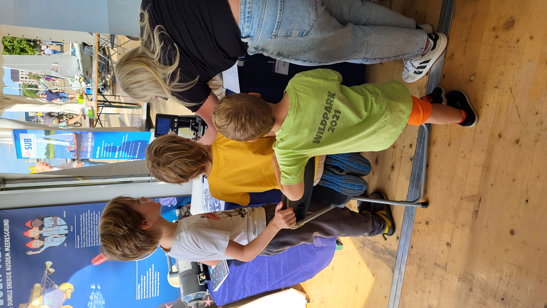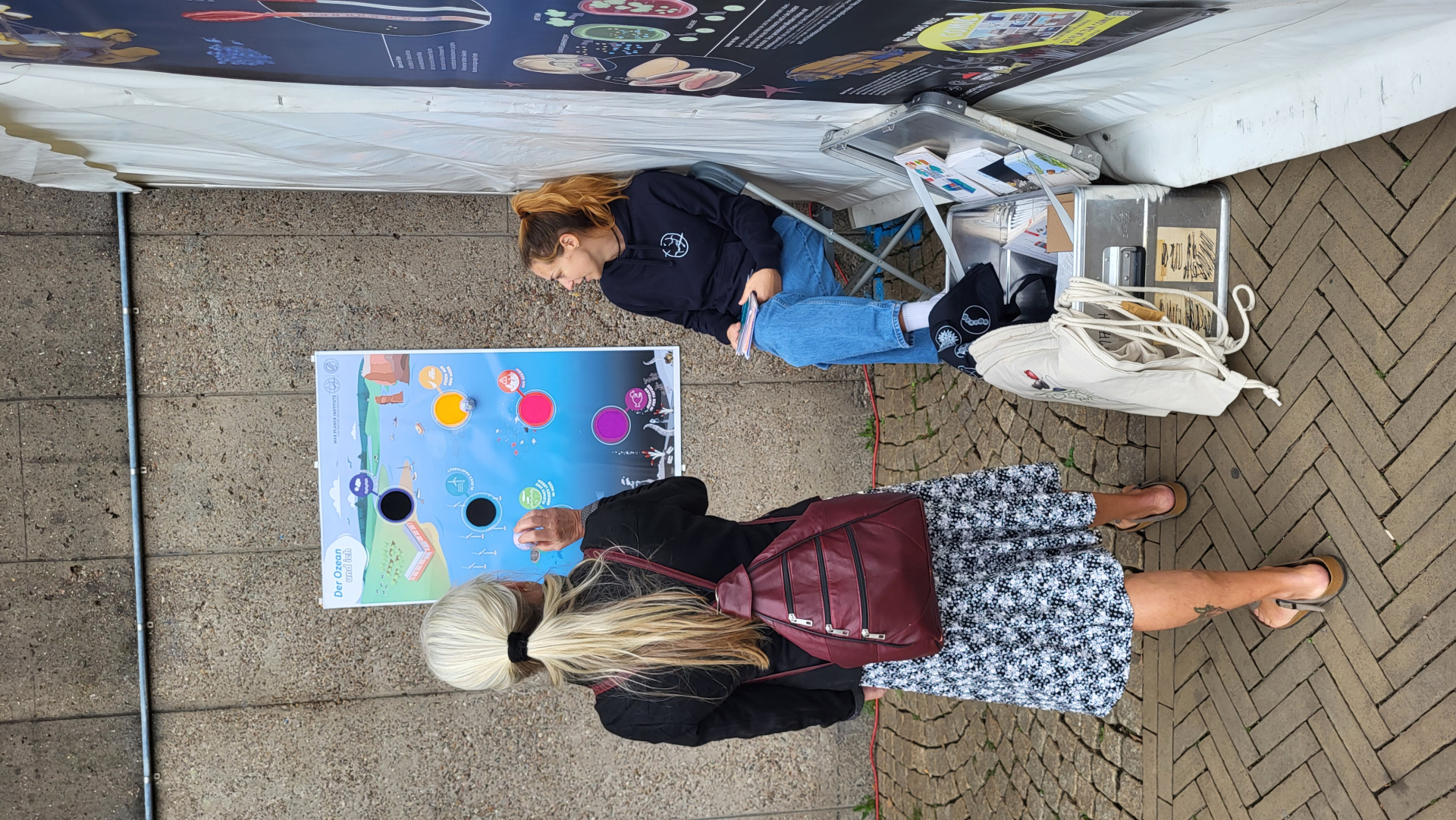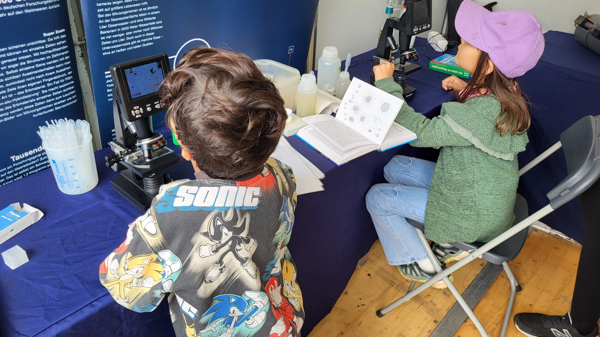 In the tent of our Max Planck Institute for Marine Microbiology, which we shared with the NWV (Naturwissenschaftlicher Verein zu Bremen), there was information and hands-on activities for researchers young and old. We presented a small insight into our research in a playful and entertaining way. Visitors had the opportunity to use microscopes with us to discover what is hidden in a drop of water, answer exciting questions in our quiz game on the topic of “The Ocean and Me,” and perhaps receive a small prize from our treasure chest.